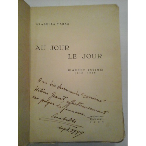 AU JOUR LE JOUR - ARABELLA YARKA - 1937 (Autograf si dedicatie autoare)