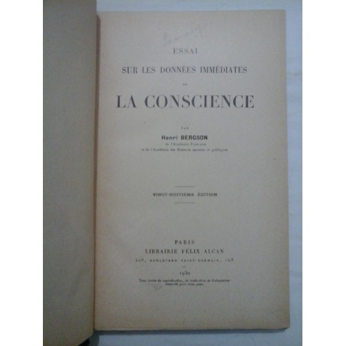 ESSAI SUR LES DONNEES IMMEDIATES DE LA CONSCIENCE - HENRI BERGSON - Paris Librairie Felix Alcan, 1930 - 184 pag.