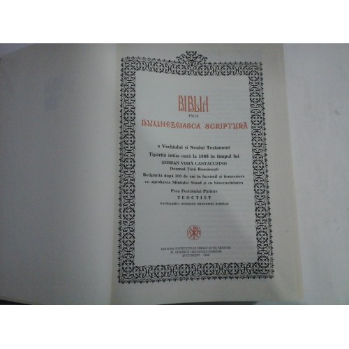 BIBLIA ADECA DUMNEZEIASCA SCRIPTURA a Vechiului si Noului Testament. Tiparita intaia oara la 1688 in timpul lui Serban Voda Cantacuzino Domnul Tarii Romanesti - retiparita dupa 300 de ani in facsimil si transcriere cu aprobarea Sfantului Sinod, cu binecuvantarea Prea Fericitului Parinte TEOCTIST Patriarhul Bisericii Ortodoxe Romane - Editura Institutului Biblic si de Misiune al Bisericii Ortodoxe Romane- Bucuresti 1988- 987 pagini ( + etui)