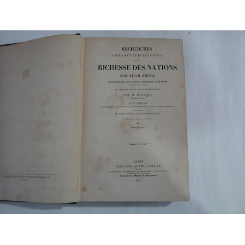 Recherches sur la nature et les causes de la RICHESSE DES NATIONS par ADAM SMITH - et precedee d une notice biographique par M.Blanqui, avec les commmentaires ,augmentee de notes inedites de Jean Bptiste Say - tome premier - Paris Chez Guillaumin Libraire 1843 - 520 pagini