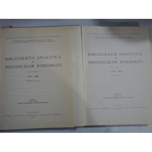 BIBLIOGRAFIA ANALITICA A PERIODICELOR ROMANESTI 1790-1850 - 2 volume - volumul 1 partea 1 si partea a2a - intocmita de IOAN LUPU,NESTOR CAMARIANO si OVIDIU PAPADIMA - Editura Academiei RSR 1966 - 823 pagini