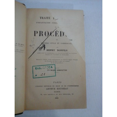 TRAITE ELEMENTAIRE D'ORGANISATION JUDICIAIRE, DE COMPETENCE ET DE PROCEDURE EN CIVILE ET COMMERCIALE - Henri BONFILS - Paris, 1892 - 552 pag.